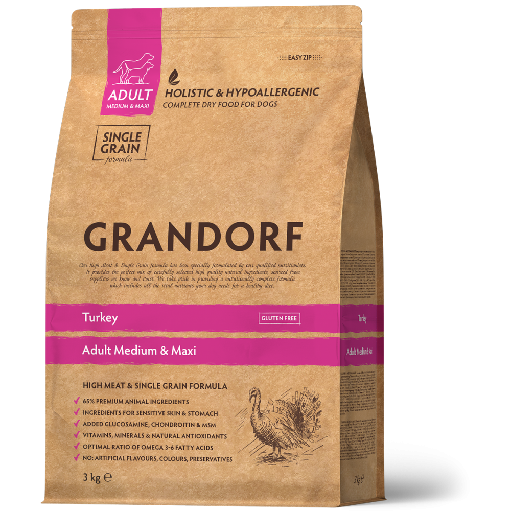 Hrană Uscată Hipoalergenică Fără Cereale cu Curcan pentru Câini Adulți de Talie Medie și Mare Grandorf 3 Kg