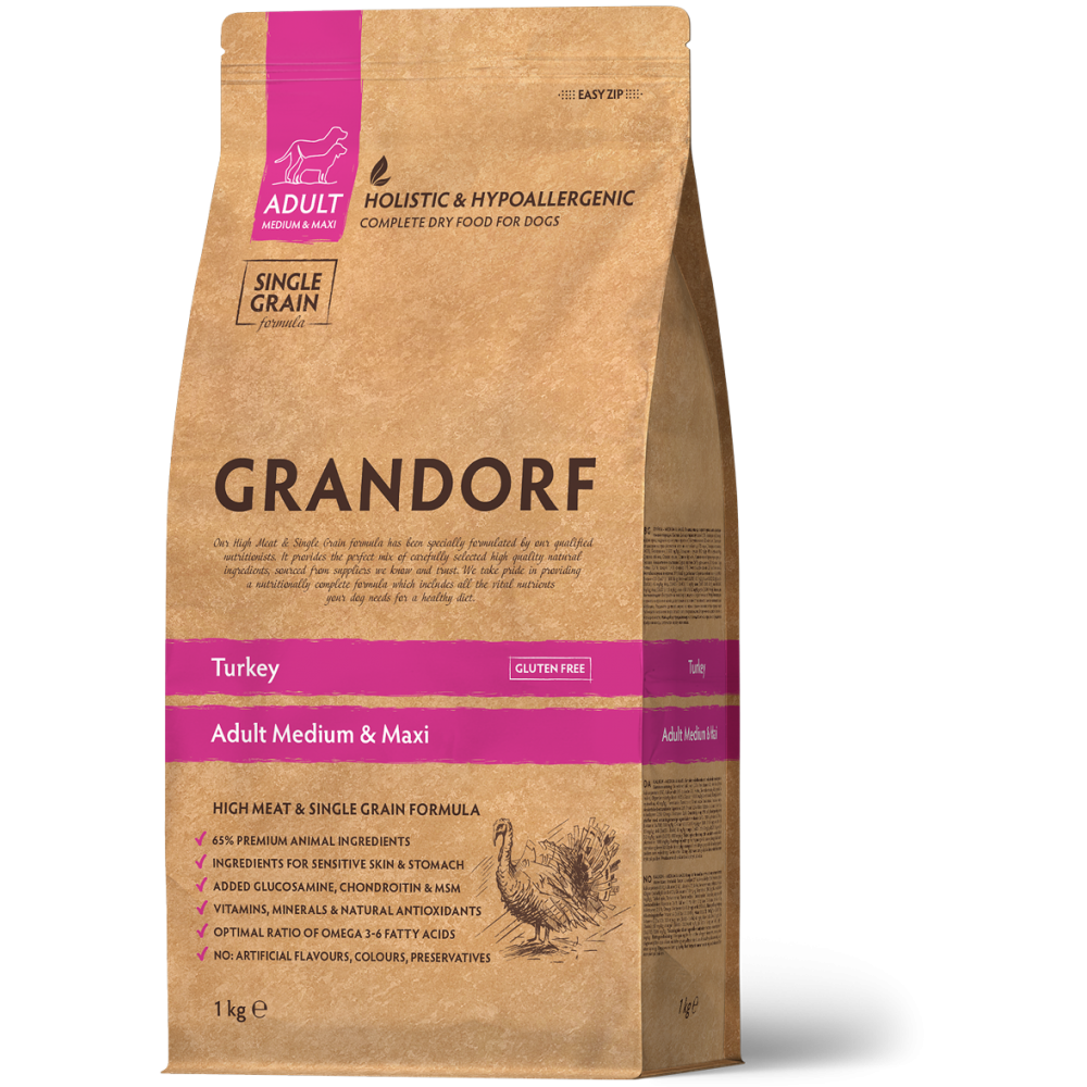 Grandorf Turkey Medium & Maxi Breeds este o hrană completă, naturală și echilibrată, creată special pentru câinii adulți de talie medie și mare. Conține carne proaspătă și deshidratată de curcan – o sursă excelentă de proteine ușor digerabile și aminoacizi esențiali pentru sănătatea mușchilor și a sistemului imunitar.