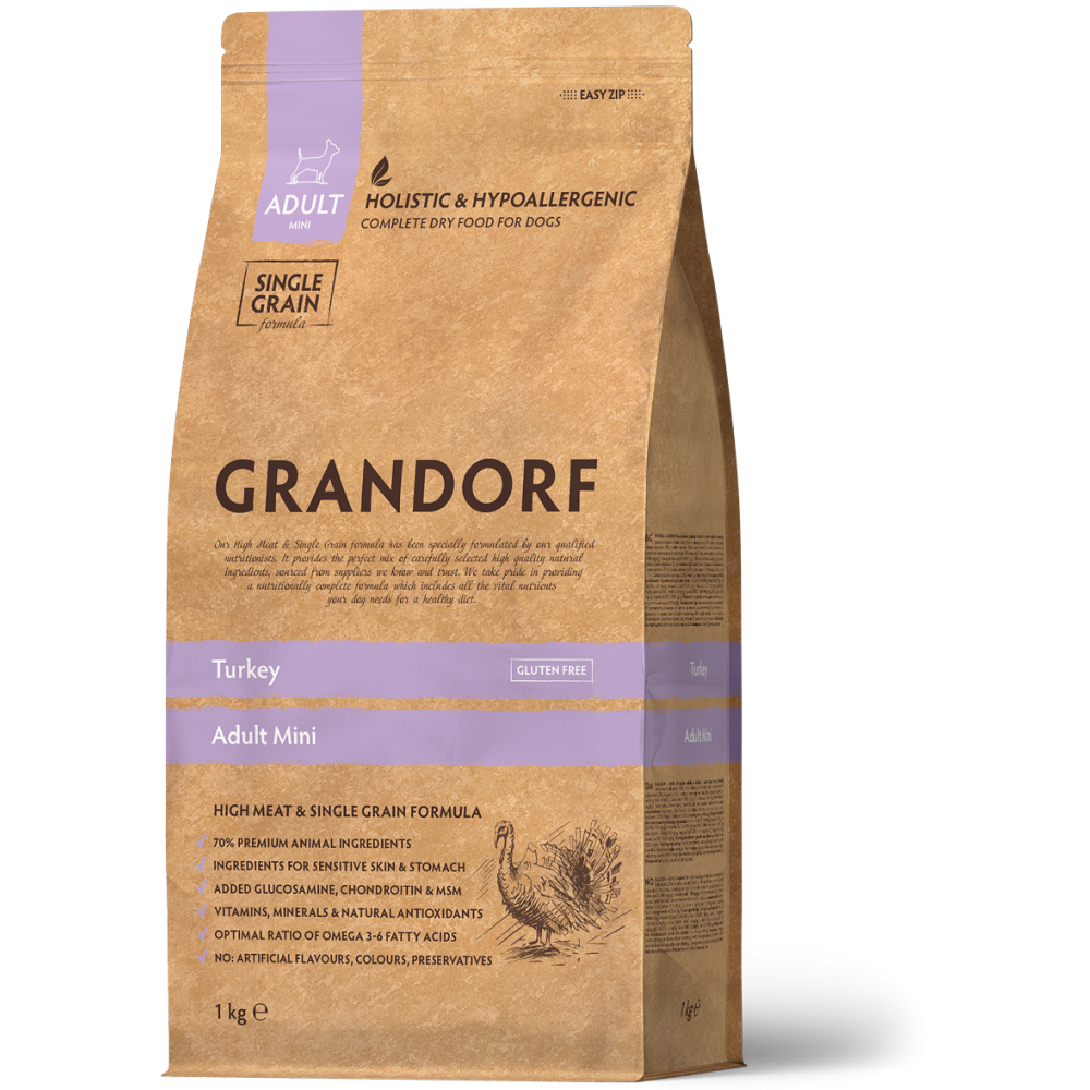 Hrană Uscată Hipoalergenică Fără Cereale cu Curcan pentru Câini Adulți de Talie Mică Grandorf Fresh 1 Kg