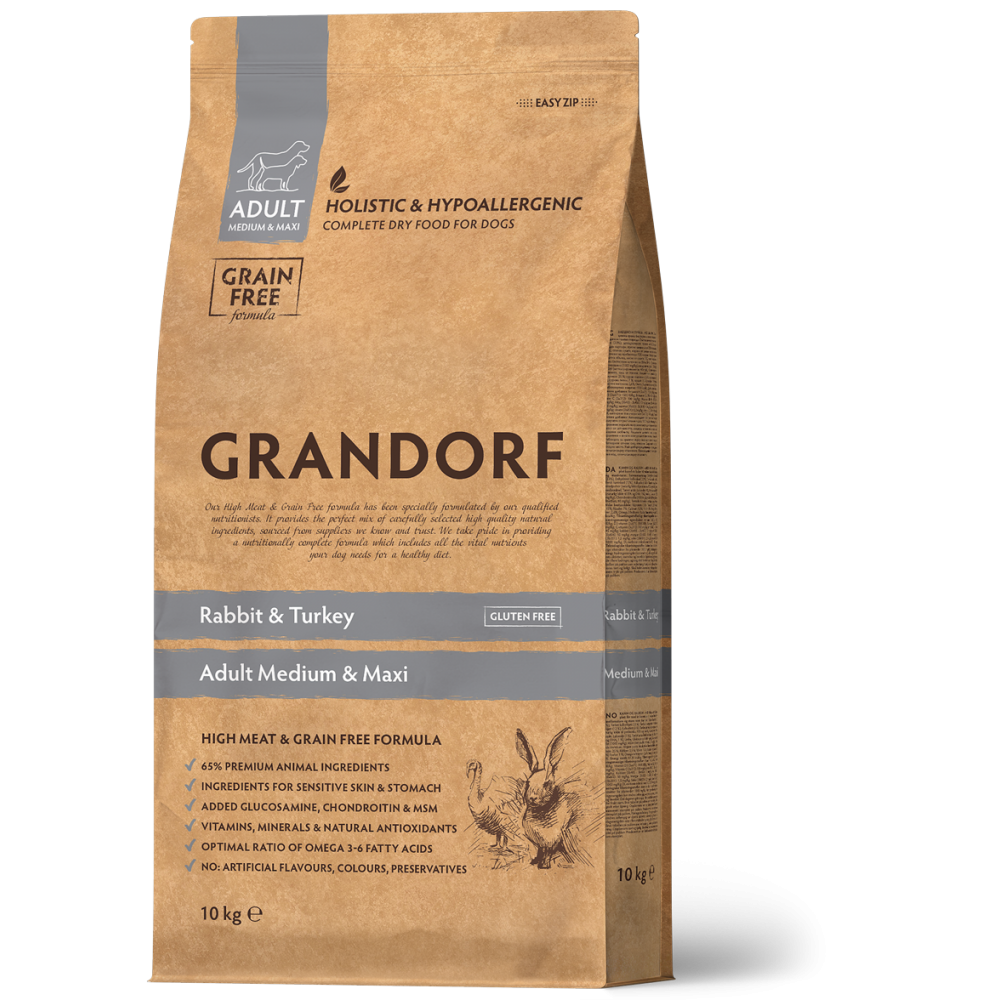 Grandorf Rabbit & Turkey Medium & Maxi Breeds este o hrană completă, naturală și echilibrată, destinată câinilor adulți de talie medie și mare. Conține carne de iepure și curcan – surse de proteine ușor digerabile, bogate în aminoacizi esențiali, vitamine și minerale, potrivite pentru câinii sensibili.
