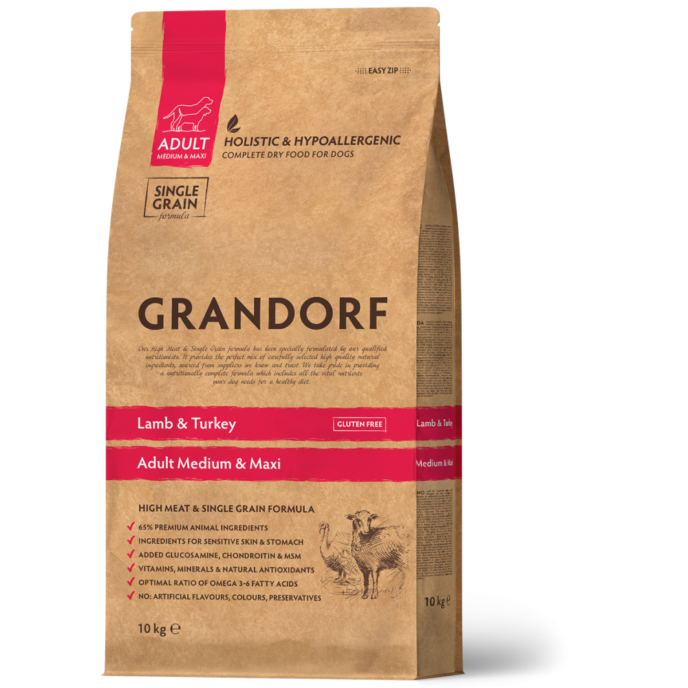 Grandorf Lamb & Turkey Medium & Maxi Breeds este o hrană completă și echilibrată, formulată special pentru câinii adulți de talie medie și mare. Combinația de carne proaspătă de miel și curcan oferă proteine ușor digerabile, acizi grași esențiali și un gust natural excelent.