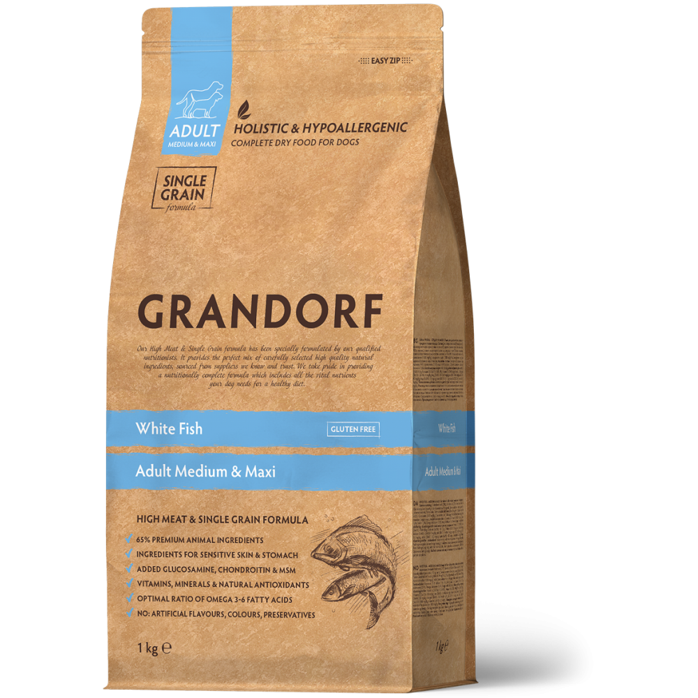 Grandorf White Fish Medium & Maxi Breeds este o hrană completă, naturală și echilibrată, formulată special pentru câinii adulți de talie medie și mare. Conține pește alb oceanic (cod și hering), bogat în proteine ușor digerabile și acizi grași Omega-3, esențiali pentru pielea sănătoasă și blana strălucitoare.
