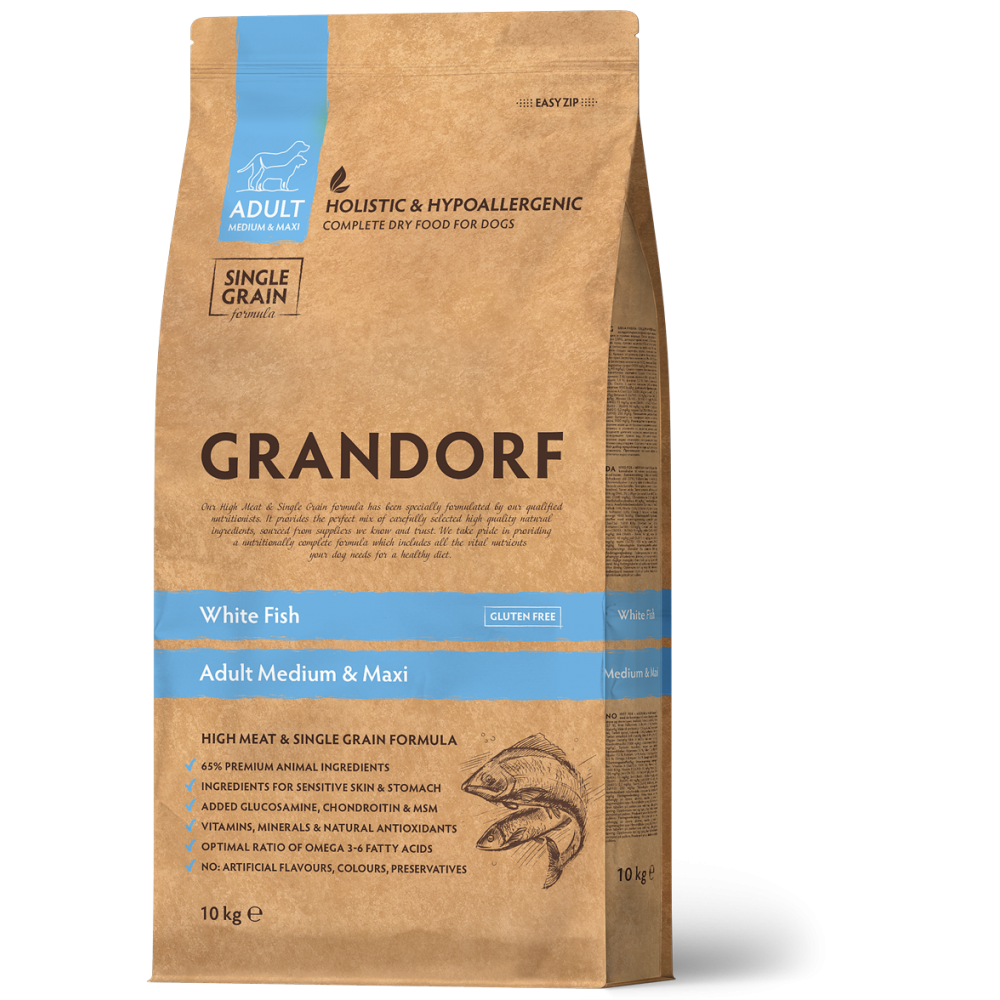 Grandorf White Fish Medium & Maxi Breeds este o hrană completă, naturală și echilibrată, formulată special pentru câinii adulți de talie medie și mare. Conține pește alb oceanic (cod și hering), bogat în proteine ușor digerabile și acizi grași Omega-3, esențiali pentru pielea sănătoasă și blana strălucitoare.