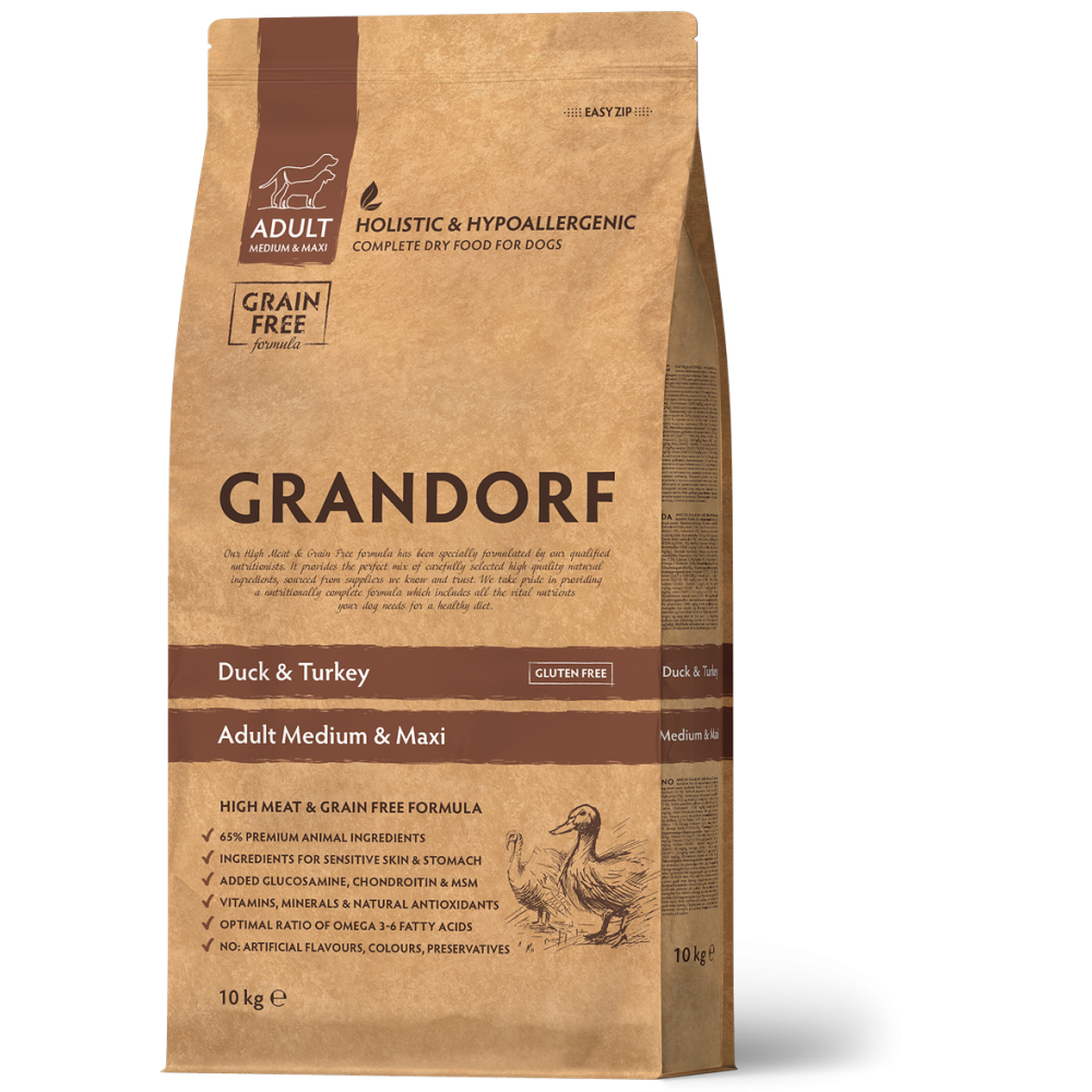 Hrană Uscată Hipoalergenică Fără Cereale cu Rață și Curcan pentru Câini Adulți de Talie Medie și Mare Grandorf Fresh 10 Kg