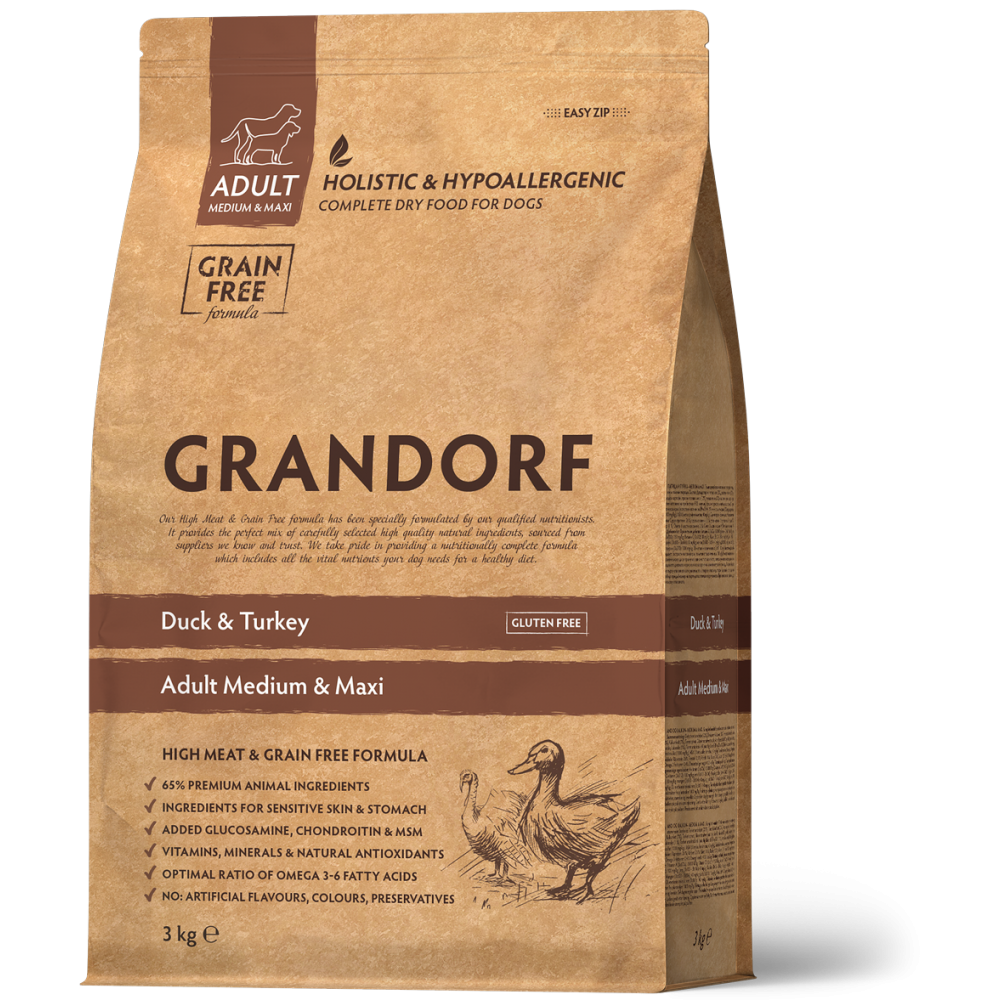 Grandorf Duck & Turkey Medium & Maxi Breeds este o hrană completă, naturală și echilibrată pentru câinii adulți de talie medie și mare. Rețeta conține carne proaspătă și deshidratată de rață și curcan – surse excelente de proteine ușor digerabile, bogate în vitamine și minerale naturale.