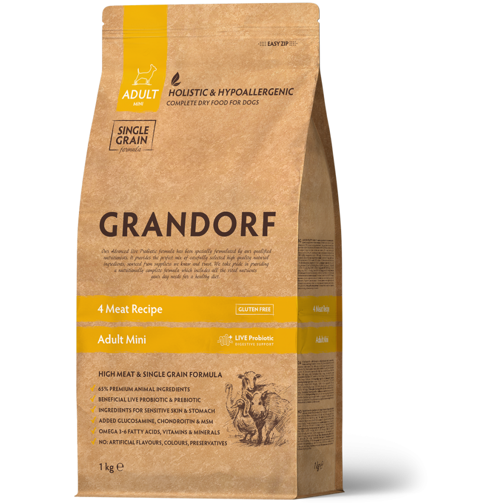 Hrană Uscată Holistică Fără Cereale cu 4 Tipuri de Carne pentru Câini Adulți de Talie Mică Grandorf Fresh 1 Kg