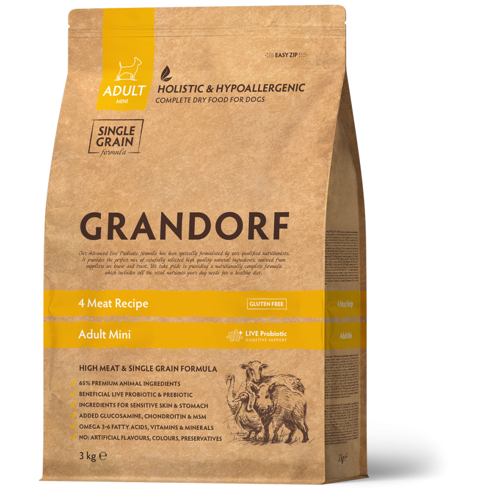 Hrană Uscată Holistică Fără Cereale cu 4 Tipuri de Carne pentru Câini Adulți de Talie Mică Grandorf Fresh 3 Kg