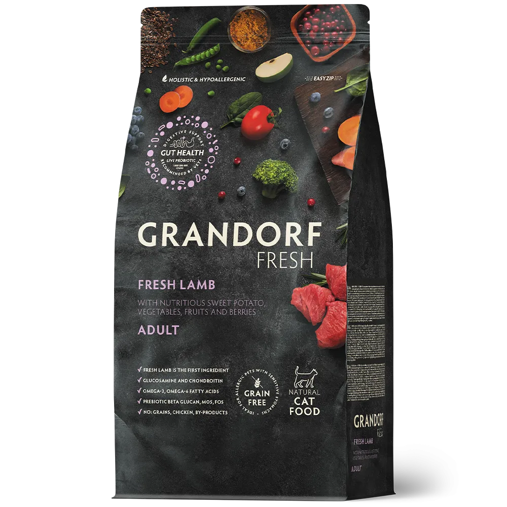 Grandorf Fresh Lamb Meat with Sweet Potato for Adult Cats este o hrană completă, echilibrată și hipoalergenică, concepută pentru pisici adulte cu digestie sensibilă sau predispuse la reacții alergice. Conține carne proaspătă de miel, bogată în proteine ușor digerabile și aminoacizi esențiali care contribuie la menținerea masei musculare și a stării generale de sănătate.