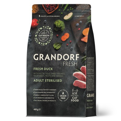 Hrană Uscată Holistică Fără Cereale cu Carne Proaspătă de Rață și Cartof Dulce pt. Pisici Sterilizate sau Senior Grandorf 400 g