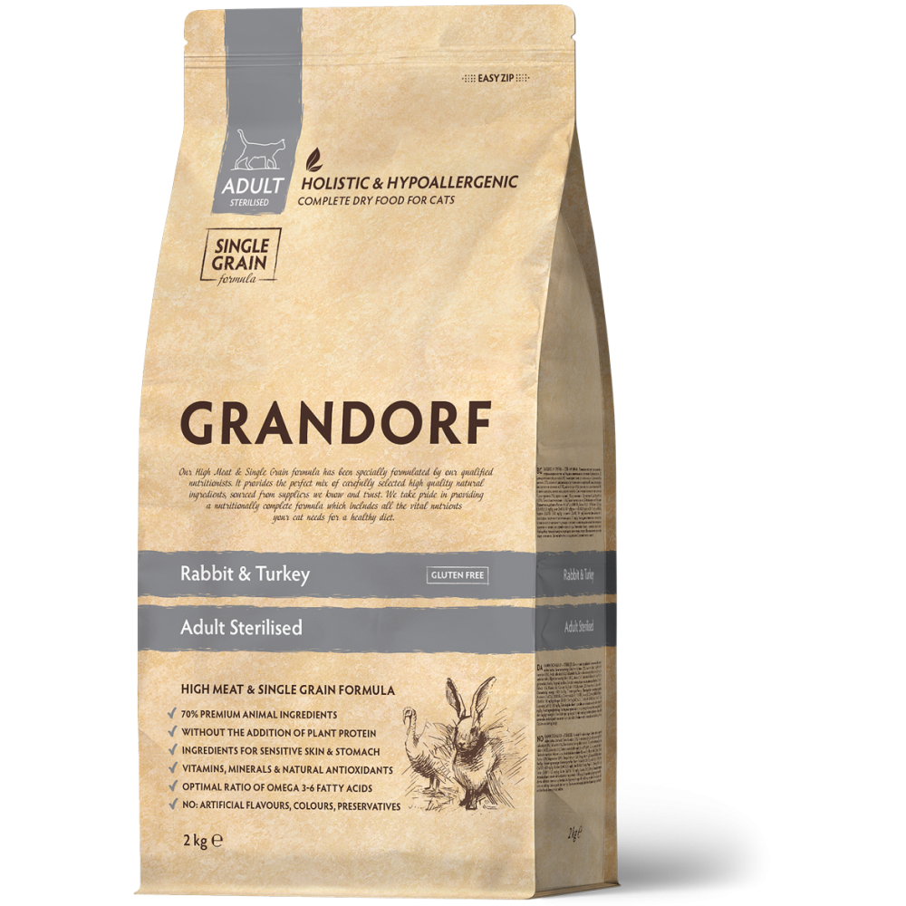 Hrană Uscată Holistică Fără Cereale cu Iepure și Curcan pentru Pisici Sterilizate sau Seniori Grandorf 2 Kg