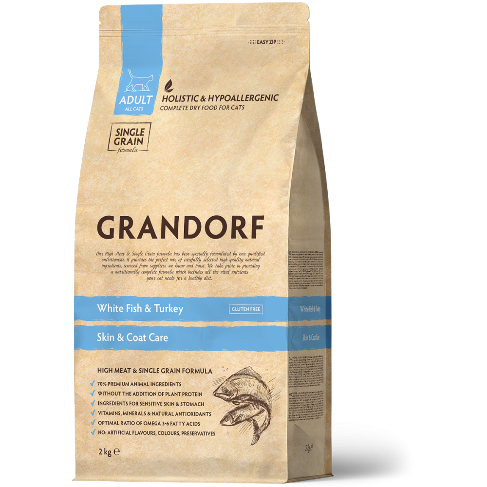 Grandorf White Fish & Turkey for Adult Cats with Sensitive Skin and Coat este o hrană holistică, naturală și echilibrată, concepută pentru pisicile adulte cu piele sensibilă, blană ternă sau intoleranțe alimentare.