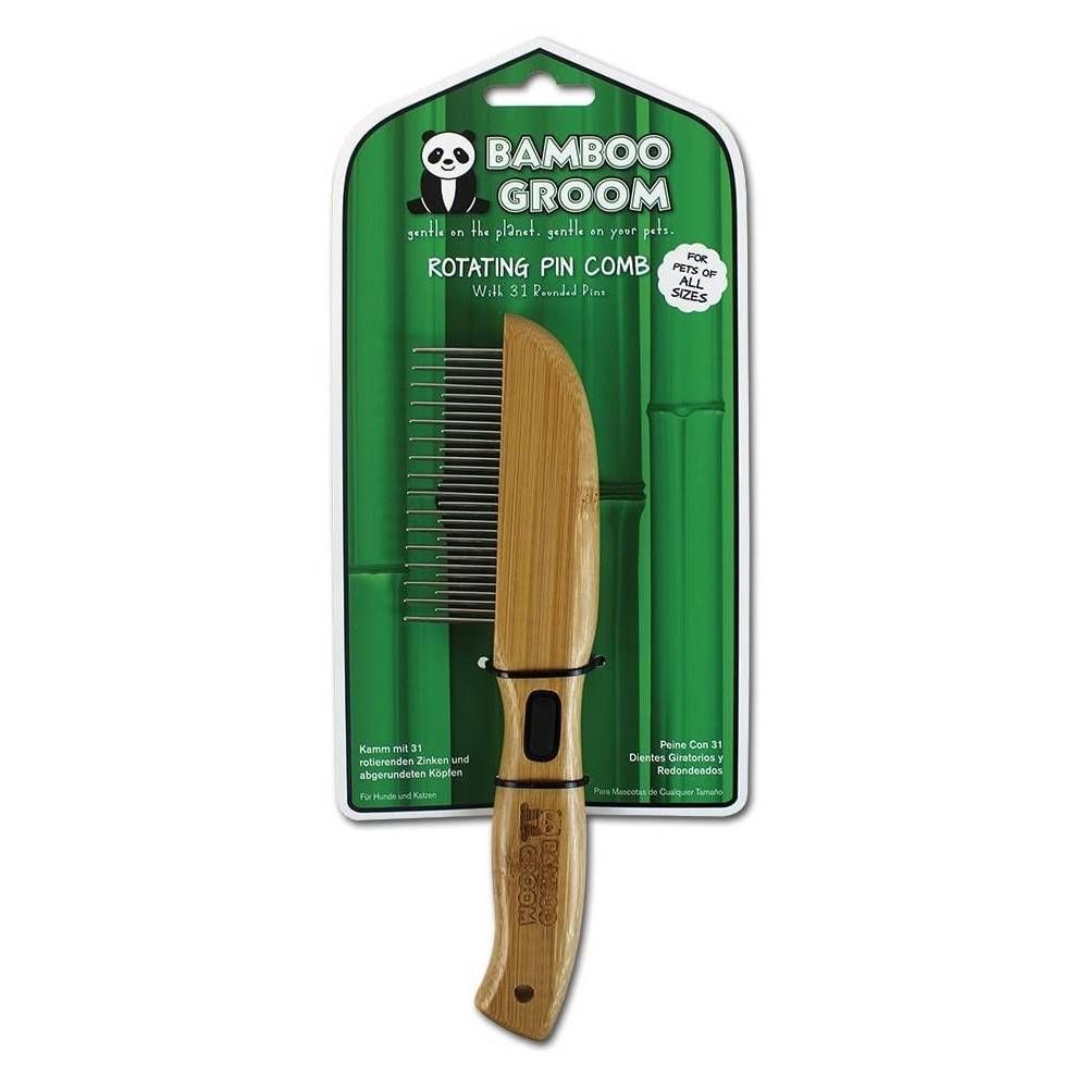 Pieptenele rotativ cu dinti rotunjiti de la Bamboo Groom este conceput pentru cateii si pisicile cu blana mai lunga si este prevazut cu 31 de dinti metalici cu o lungime de 2,5 cm si 1,6 cm.