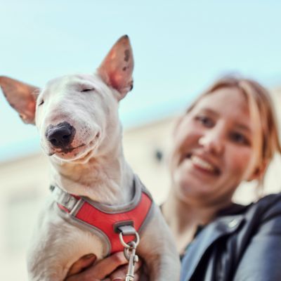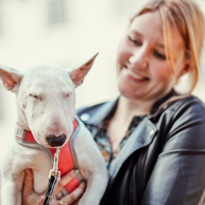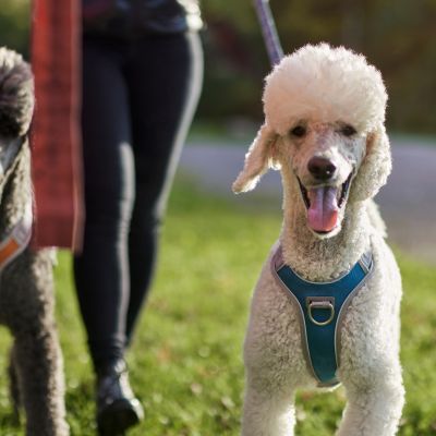 Lauda si recompensarea, cum ar fi o delicatesa atunci cand cainele se opreste sau incetineste, ajuta la dresare cainelui Dvs. pentru a merge in ham si lesa.