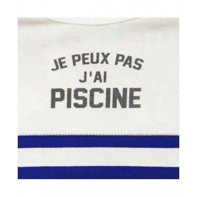 Design: Tricou dungi albastru si alb cu imprimeu gri «Je peux pas j'ai piscine»