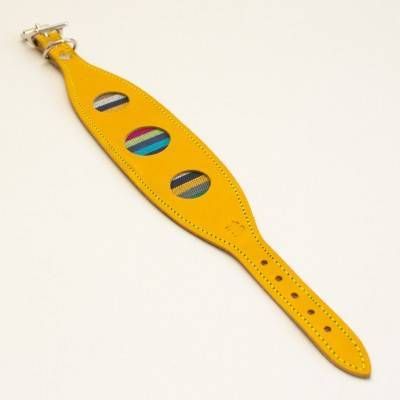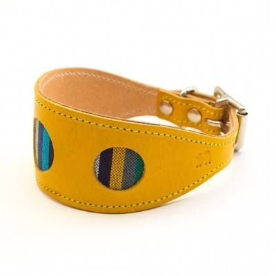 Aceste zgarzi de lux Hiro + Wolf pentru Ogar englez si Whippet sunt facute manual din piele groasa. Au un design unic, circular, taiat prin laser care scoate in evidenta un material dungat vibrant colorat, achizitionat in timpul aventurilor manufacturierilor prin Africa de Est.